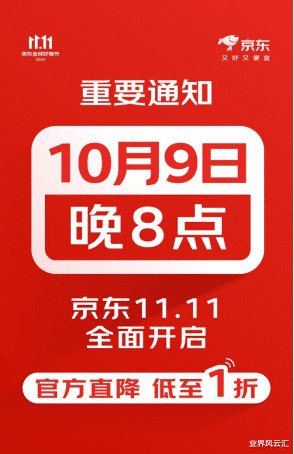 9月29日,京东宣布,今年京东11.11将于10月9日晚8点现货开卖。在汇集海量热销爆款好物的同时,将提供“官方直降 低至1折”的优惠福利,为消费者带来又好又便宜的消费体验!