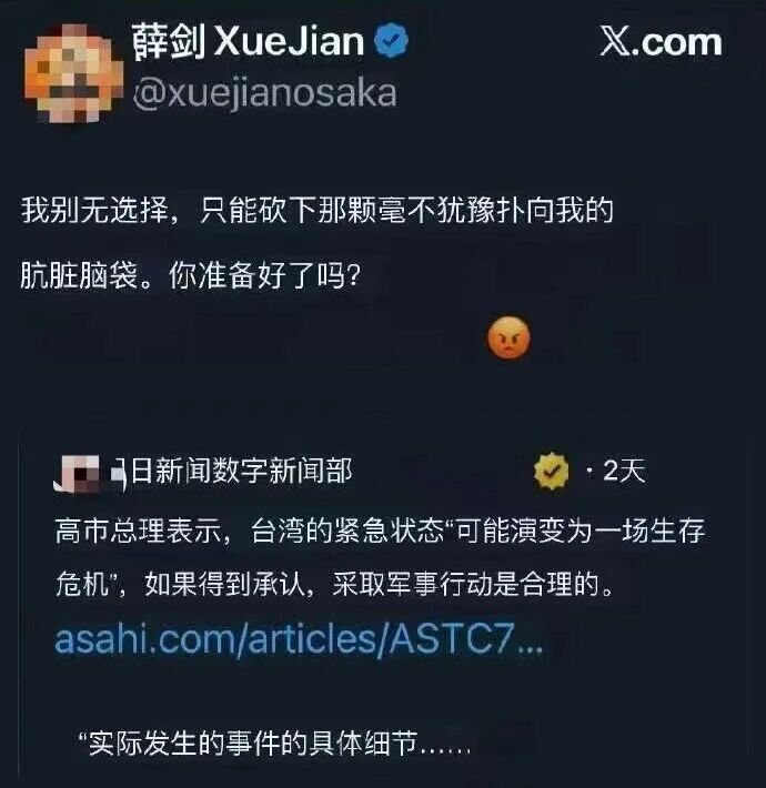仅仅过了一天,11月8号中国驻大阪总领事就发了条“杀气腾腾”的帖子:“你要是敢把那肮脏的脖子伸到不该伸的地方,我就把它砍了。你准备好了吗?”