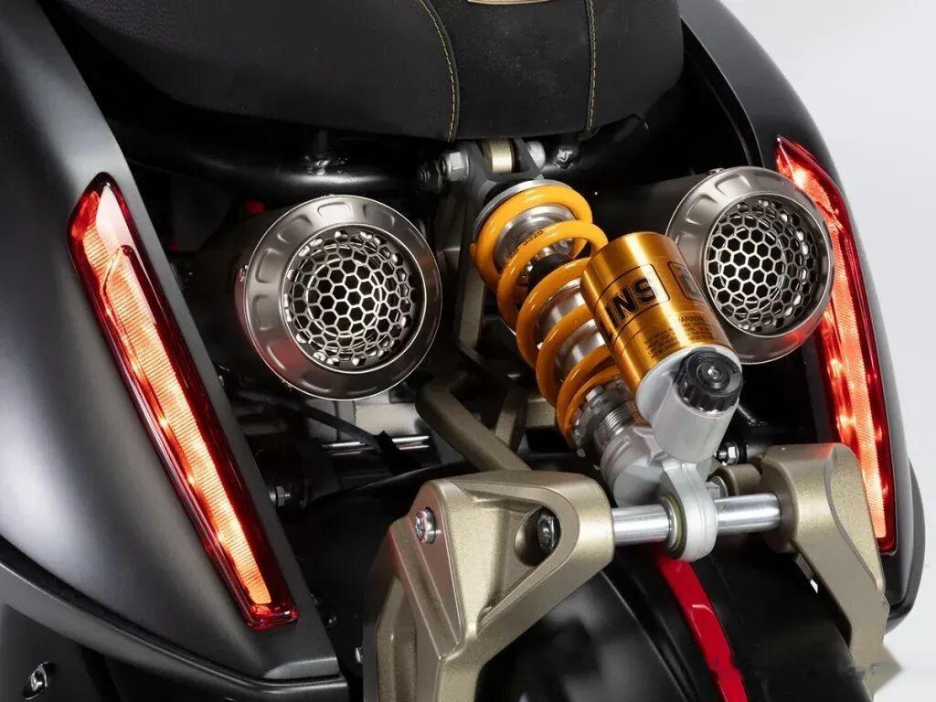 从车尾来看,可以看到座垫下方伸出的Akrapovič双出排气管之间配置着Öhlins后避震。这些结构与细节设计,充分展现了Italjet对设计与技术的极端追求,每个角度都充满意大利式的戏剧张力以及浓厚的工艺与美学气息。