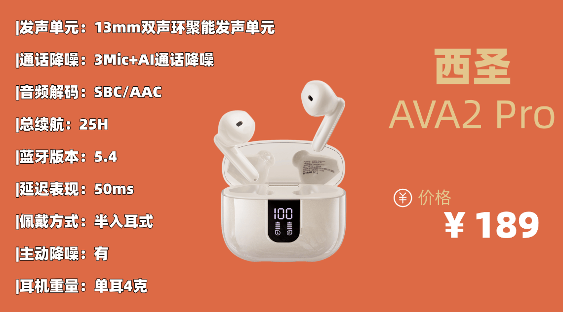 ◆想找一款百元高性价比半入耳耳机,学生党上课通勤用?我推荐西圣AVA2 Pro,实测对比200元内同类耳机,音质最优,性价比直接拉满。西圣AVA2 Pro蓝牙耳机上线以来,打造了一个又一个销量神话,人气口碑稳居国产蓝牙耳机前三。新品刚上线时,火到常常卖断货,它的爆火绝不是偶然,这款售价不到200元,配置、音质、降噪堪比千元机的高性价比蓝牙耳机,号称是耳机里的小金刚。