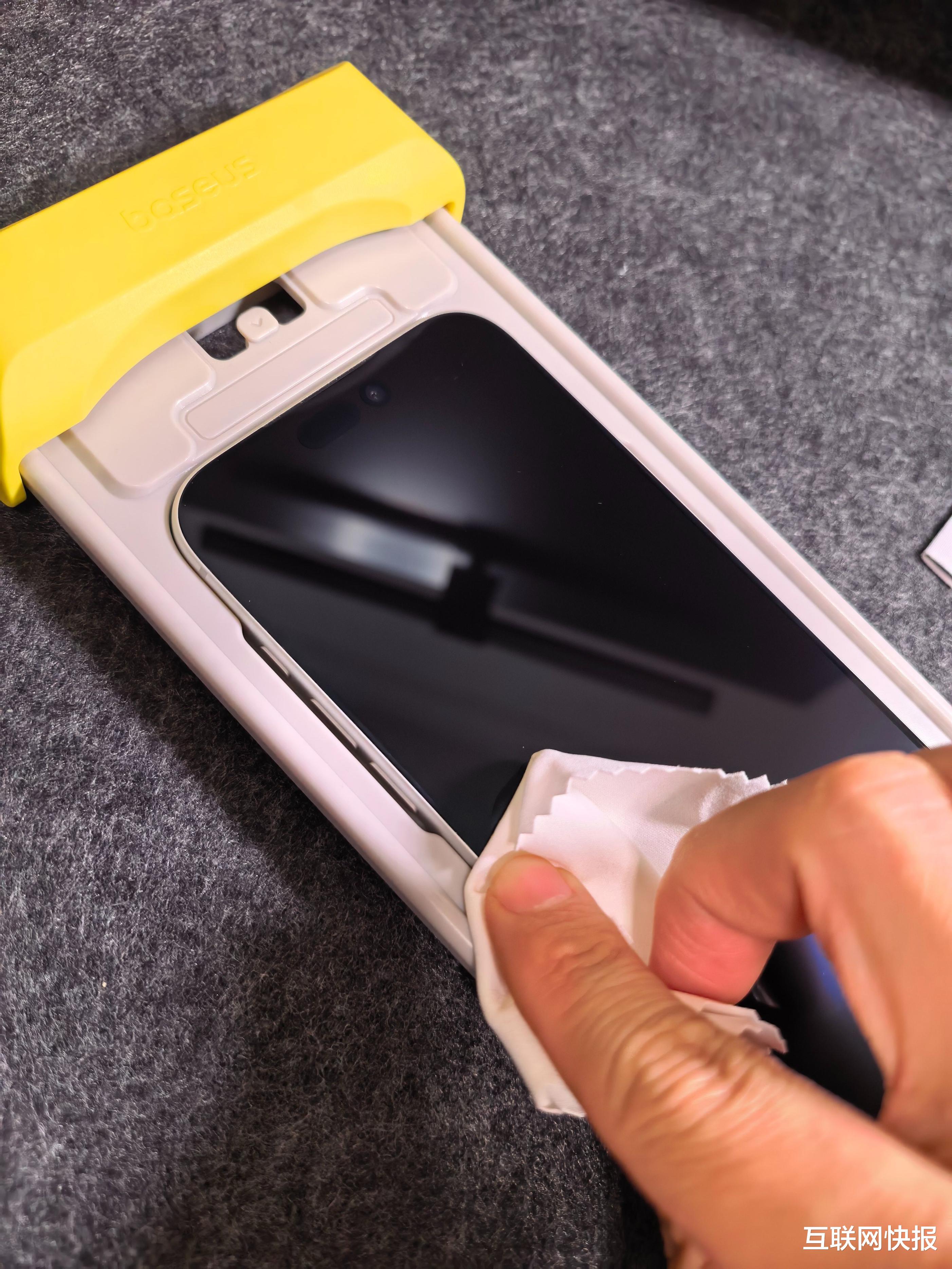 第一步,清洁预处理。先用附赠的酒精棉片擦去屏幕指纹油污,再用干擦布擦干,最后用强力除尘贴粘走缝隙里的犄角旮旯灰尘 —— 这步是基础,把屏幕清洁干净,后续贴膜才不会有 “灰尘小气泡” 捣乱,不用再对着屏幕 “放大镜找罪证”。