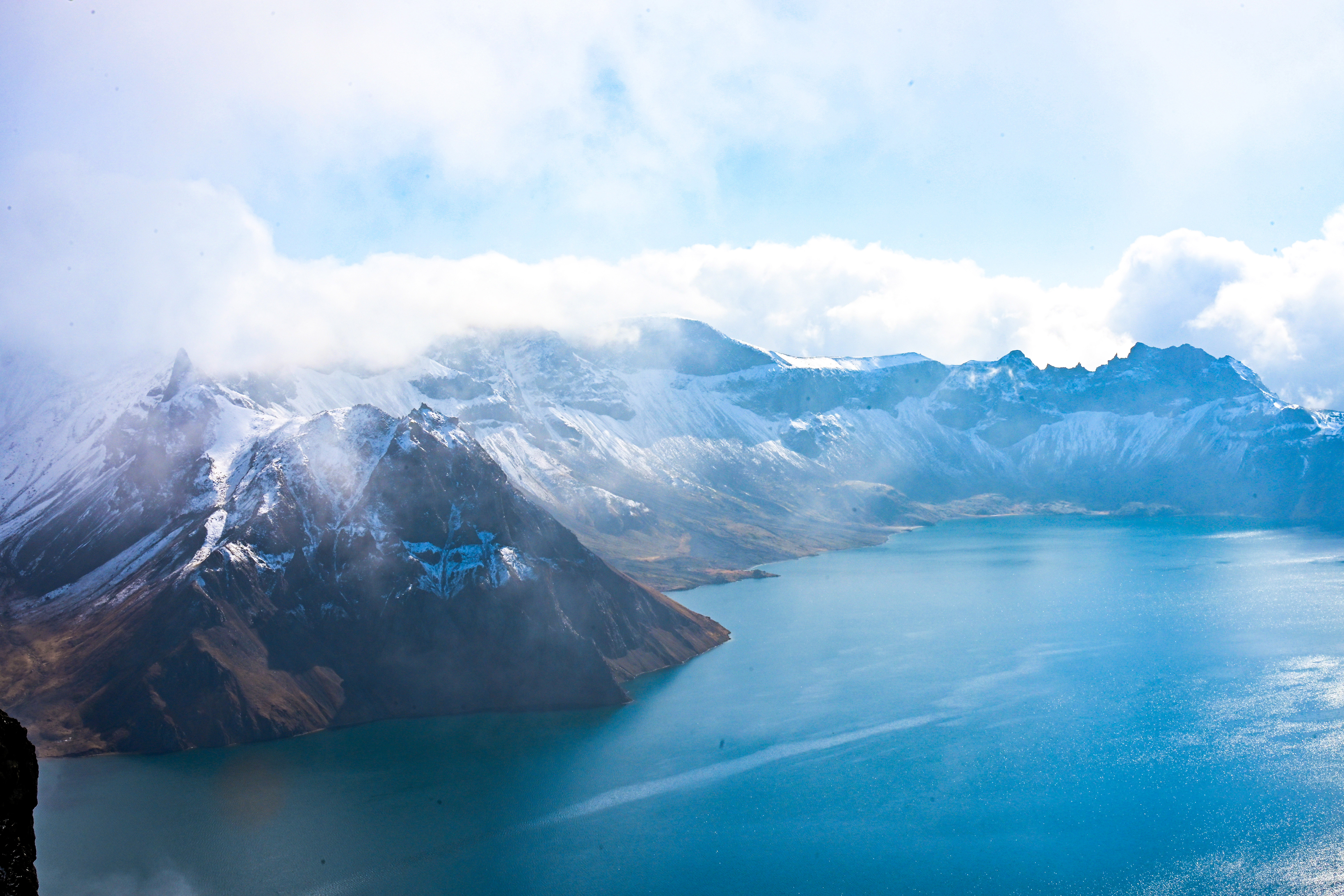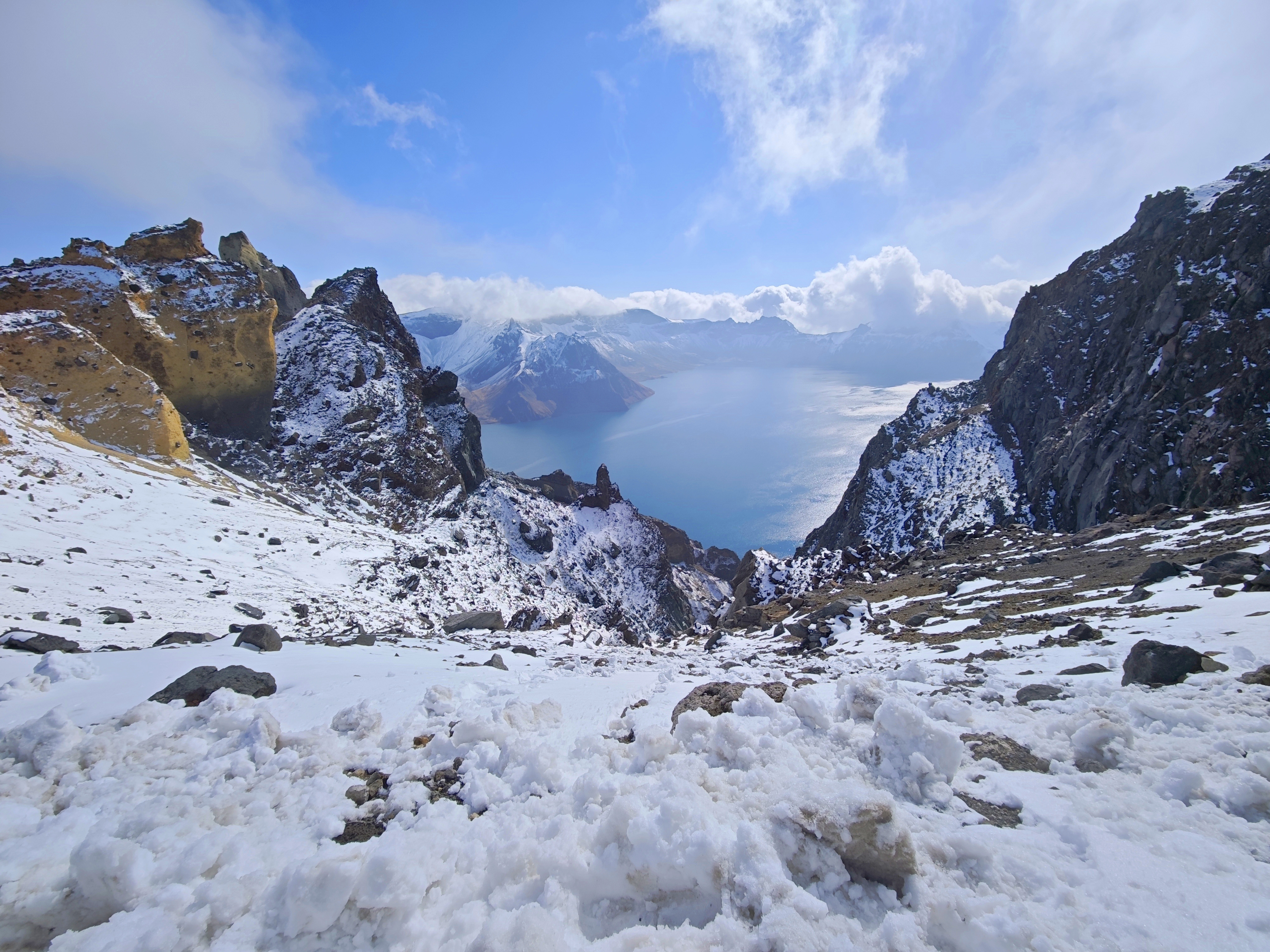 抵达天池观景台时,这里早已挤满了和我一样等待的游客。我挤在人群中,望着被浓雾彻底吞噬的湖面,只能跟着大家一起沉默地守候。身旁一对情侣听我说从南方远道而来,特意往旁边挪了挪,笑着让我站到前排。我蹲在观景台的石阶边,目光死死锁着雾气最浓的那片区域,连呼吸都下意识放轻,怕惊扰了可能随时到来的晴朗。不知过了多久,人群中突然爆发出一阵整齐的惊呼——阳光像利剑般穿云破雾,湛蓝的天池湖面毫无预兆地在眼前铺展开来,与周边连绵的皑皑白雪相映成趣。那抹纯粹的蓝,干净得能映出天空的影子,搭配着雪的白,美得让人瞬间失语。我赶紧按下快门,相机的“咔嚓”声混在众人的赞叹里,成了此刻最动听的注脚。