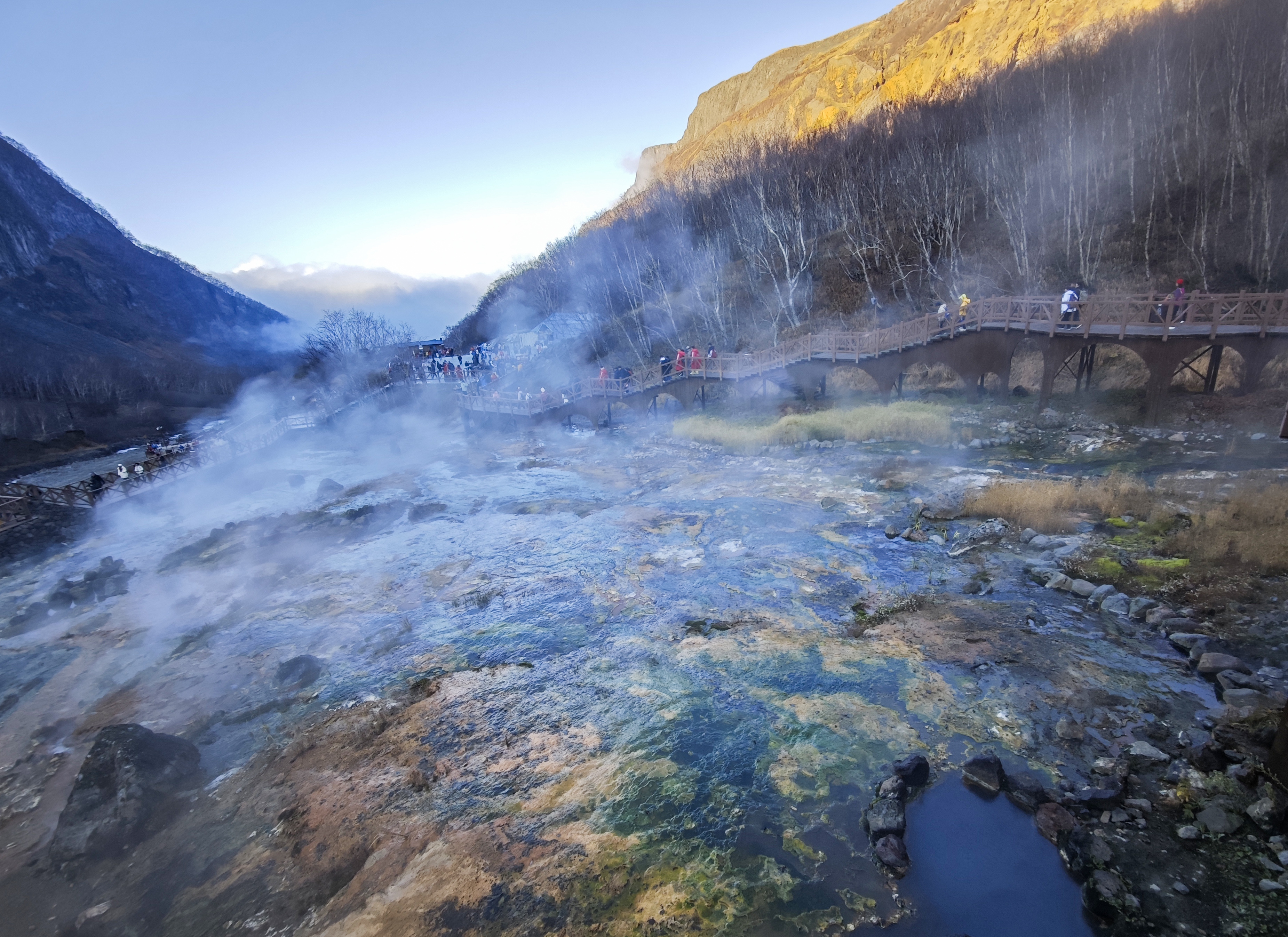 下山时,浓雾再度卷土重来。想着瀑布、温泉等景点还没来得及探访,就又被山脚下的雾气困住,新的遗憾刚要冒头,山间的太阳却又一次探出头来。暖光驱散浓雾的瞬间,黑色的树干上挂着的冰晶露珠开始闪光,三三两两的行人点缀在雪路上,远处的温泉蒸腾着袅袅白雾,瀑布从雪崖上倾泻而下,在阳光下划出银亮的弧线。我站在原地,慢慢按下快门,将这意料之外的景致稳稳收入镜头。