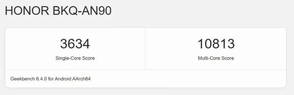对比来看,此前还有一款型号为BKQ-AN90的荣耀旗下新机现身了 Geekbench跑分。在Geekbench 6.4.0 中,单核测试得分3634分,多核测试得分10813 分。