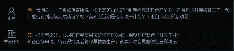 今天宁德已在互动平台官宣,宜春项目(枧下窝矿区)采矿许可证8月9日到期后,已暂停了相关开采作业,正按相关规定办理采矿证延续申请,待获得批复后将尽早恢复生产,该事项对公司整体经营影响不大。