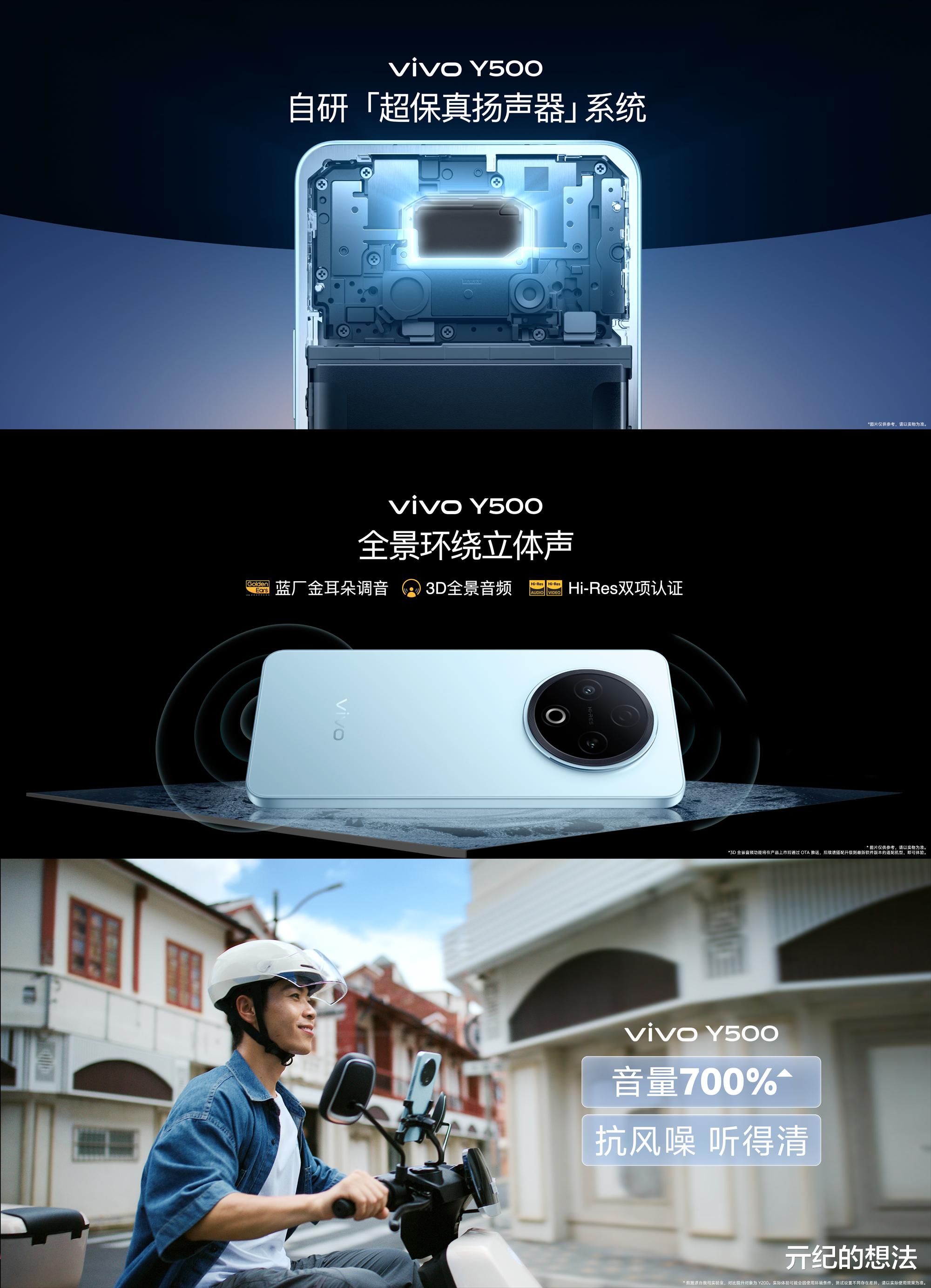 耐用性是该机的核心卖点之一,主要包括防尘防水和抗跌耐摔:vivo Y500通过了IP68和IP69防尘防水认证,拥有IP69+满级防水能力,新增了快捷排水排尘和水下摄影等功能,可以轻松应对生活中的各种小意外。机身采用金刚磐石架构,搭配随机标配的金刚抗摔膜和气囊抗摔手机壳,不仅通过了五项军标环境测试,还拿到了SGS金标五星抗跌耐摔认证,让日常生活中的摔落剐蹭都无需害怕。