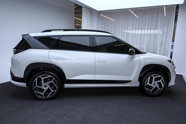 从车身侧面观察,线条处理得比较平滑,没有过多复杂的修饰,整体姿态显得比较扎实。B柱和C柱采用熏黑处理,配合时下流行的隐藏式门把手,确实为车辆增添了不少现代气息。这类设计手法在当下的电动SUV中并不多见,有助于提升视觉上的简洁度和科技氛围。不过,对于隐藏式门把手,其日常使用的便利性,尤其是在低温环境下,比如手指冰冷或佩戴手套时,实际操作的顺畅度和手感,是需要实际接触后才能有更真切体会的。