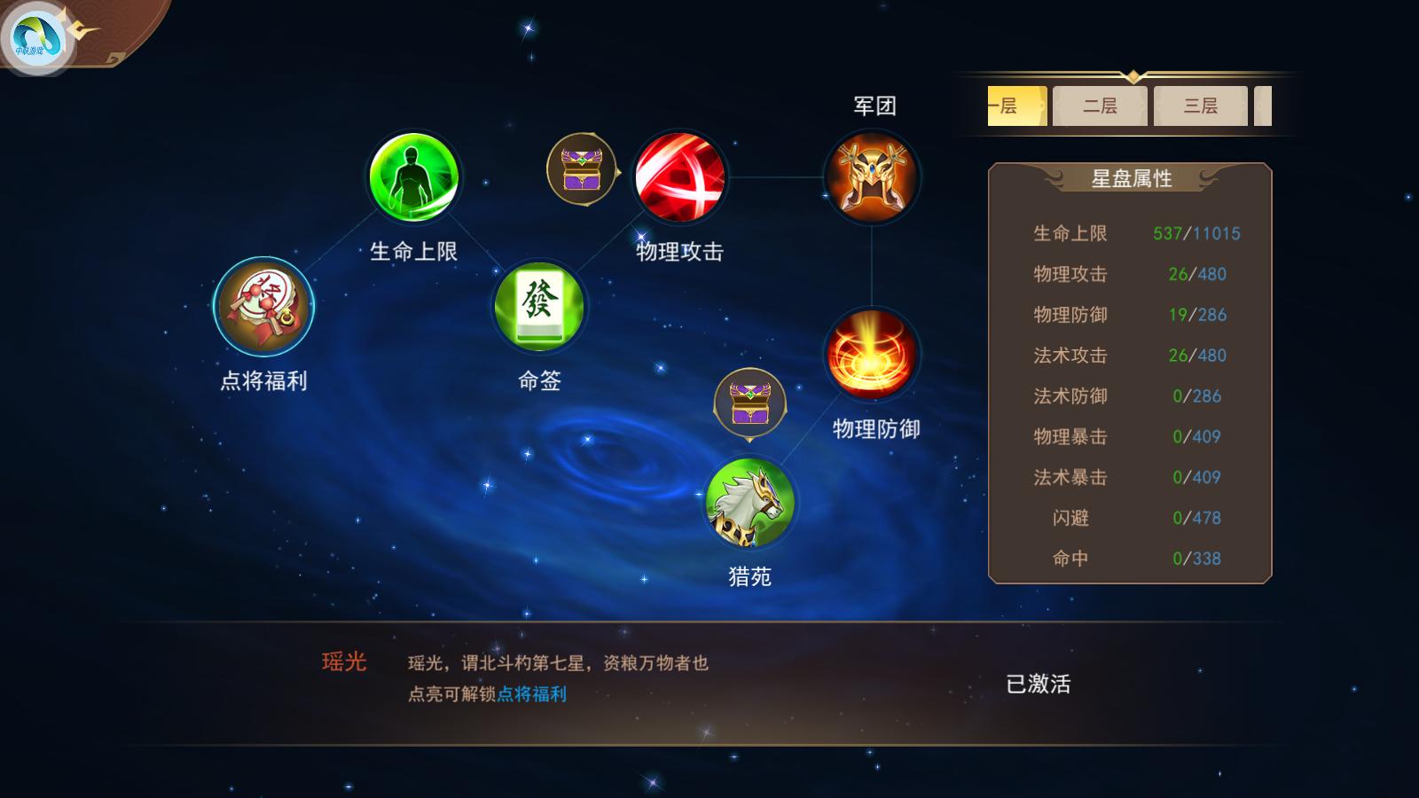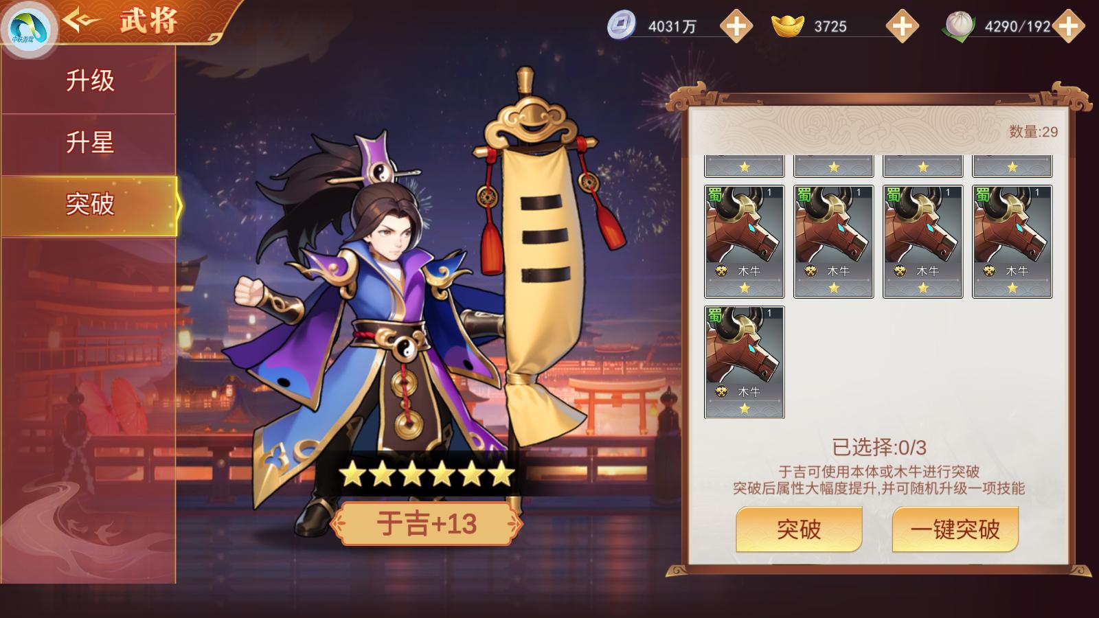 升星材料就是抽卡出来的那些紫蓝绿白卡,这些卡没什么大用,单纯就是升星材料。升级主要用扫荡推本出来的经验道具,商店兑换也可以,前期略不够用,中后期完全溢出。如果开局只养一队五个将难度不大,几天就可以升到顶。武将突破稍有难度,需要消耗本体,这个不能太强求,突破属性增加有限,重点为了升级技能和命签槽。