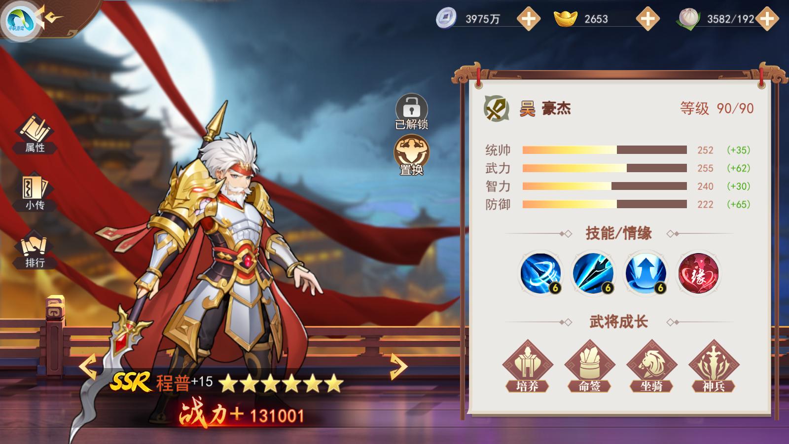 传统卡牌游戏很难做到不堆数值,毕竟数值会直接关系到每个武将的输出和防御,进而对战斗结果产生质的影响。那《掌中三国》(tap、快爆版)是怎么处理的呢?这里武将很多数值都有不太高的上限,硬性的遏制住武将卡牌属性的野蛮膨胀。比如所有橙将和红将,最高升到6星90级,没玩过的可能没有概念,这个难度相对来说并不高。
