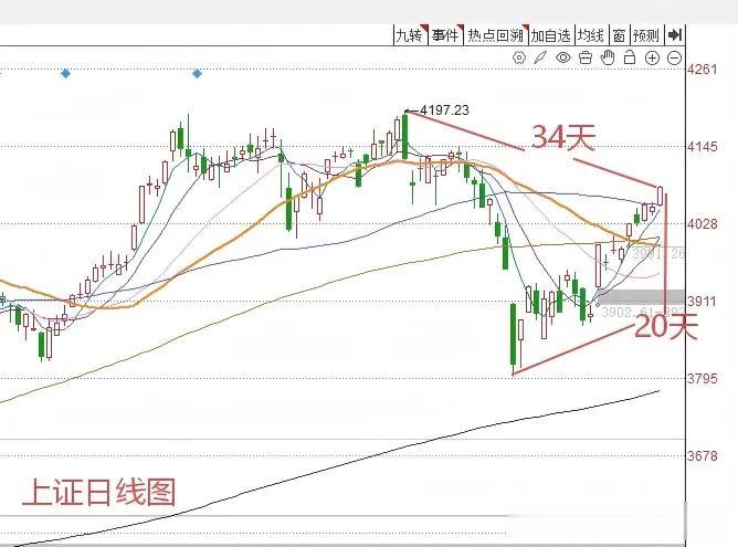 第二,从时间关系上来看,上证指数从阶段低点3794点大阴线开始到今天为止,已经连续运行了第20个交易日。到明天的时候就会到达第21个交易日。而21是典型的斐波纳契变盘数字。在第21天产生拐点的可能性相对较大。而且从3月3日4197点,到今天为止,一共是第34个交易日。34也是典型的斐波纳契边看数字。所以从时间因素这个角度来看,今天或者明天成为阶段小拐点的可能性相对是比较大的。