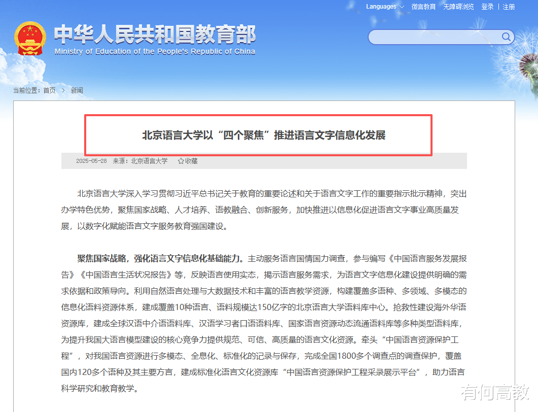 在重大国家级项目中,北语的贡献同样不可忽视。据官媒消息,北语牵头实施的“中国语言资源保护工程”,已完成全国1800多个调查点的调查保护,覆盖国内120多个语种及其主要方言,建成标准化语言文化资源库“中国语言资源保护工程采录展示平台”。