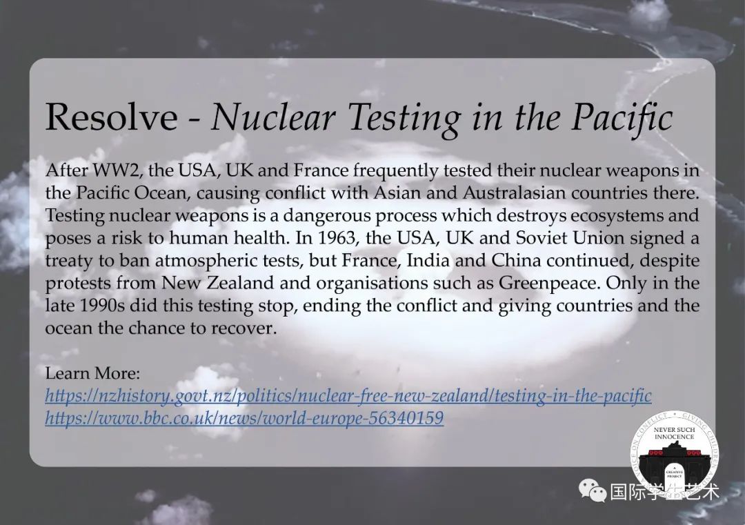 试验武器是一个危险的过程,它会破坏生态系统,对人类健康构成威胁。1963年,美国、英国和苏联签署了一项禁止大气试验的条约,但法国、印度继续进行,尽管遭到了新西兰和绿色和平组织的抗议,但直到上世纪90年代末,这种测试才停止,结束了冲突,给各国和海洋恢复的机会。