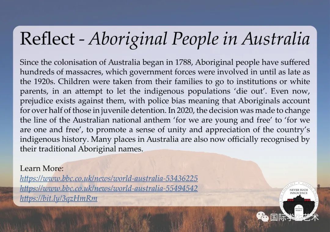 自1788年阿达里亚开始殖民统治以来,土著居民遭受了数百次屠杀,直到20世纪20年代,政府军队才介入其中。孩子们被从他们的家庭带到机构或白人父母那里,试图让土著人口“灭绝”。即使是现在,对他们的偏见仍然存在,警察的偏见意味着土著人占少年犯的一半以上。2020年,澳大利亚决定将国歌“我们年轻而自由”改为“我们团结而自由”,以促进团结感和对该国土著历史的尊重。澳大利亚的许多地方现在也被官方认可为传统的土著名字。