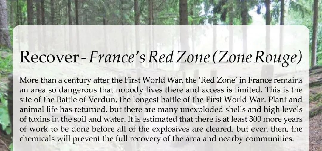 在第一次世界大战结束一个多世纪后,法国的“红区”仍然是一个非常危险的地区,没有人居住在那里,出入也受到限制,这是凡尔登战役的遗址,是第一次世界大战中持续时间最长的战役。植物和动物生命都已经恢复,但在土壤和水中仍有许多未爆炸的炮弹和高浓度的毒素。据估计,在清除所有爆炸物之前,至少还有300年的工作要做,但即使到那时,化学物质也会阻碍该地区和附近社区的全面恢复。