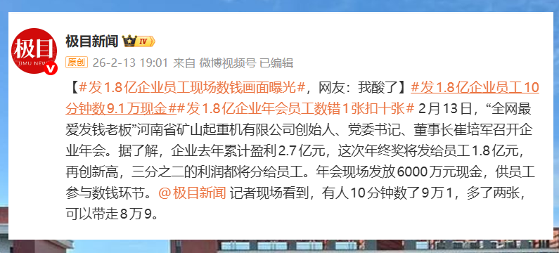 刷到河南那家企业发钱的视频时,我都羡慕了。极目新闻说,这家企业去年赚了2.7亿,崔总大手一挥,拿1.8亿分给员工。