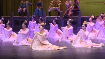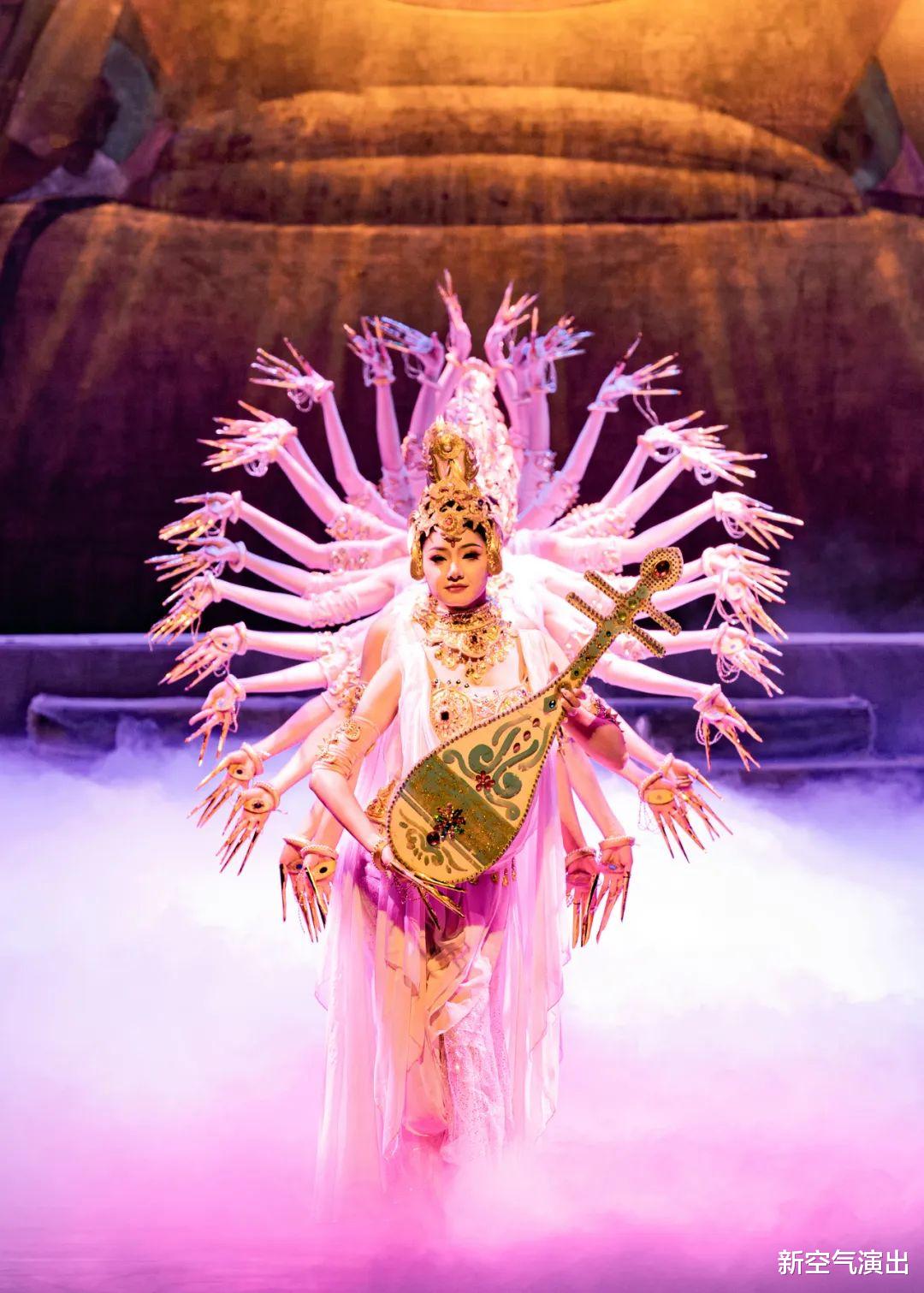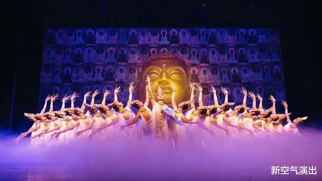 《丝路花雨》中的“金光千佛”以千手观音造型为核心,通过服饰的宗教元素与唐代敦煌艺术结合,既严谨还原了壁画原型,又以动态编排赋予静态图像生命力。将佛国世界的庄严璀璨凝练为舞台上的“一眼千年”成为敦煌舞剧最具辨识度的文化符号之一。