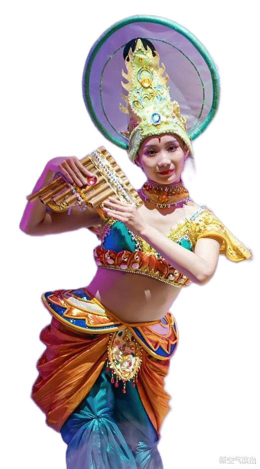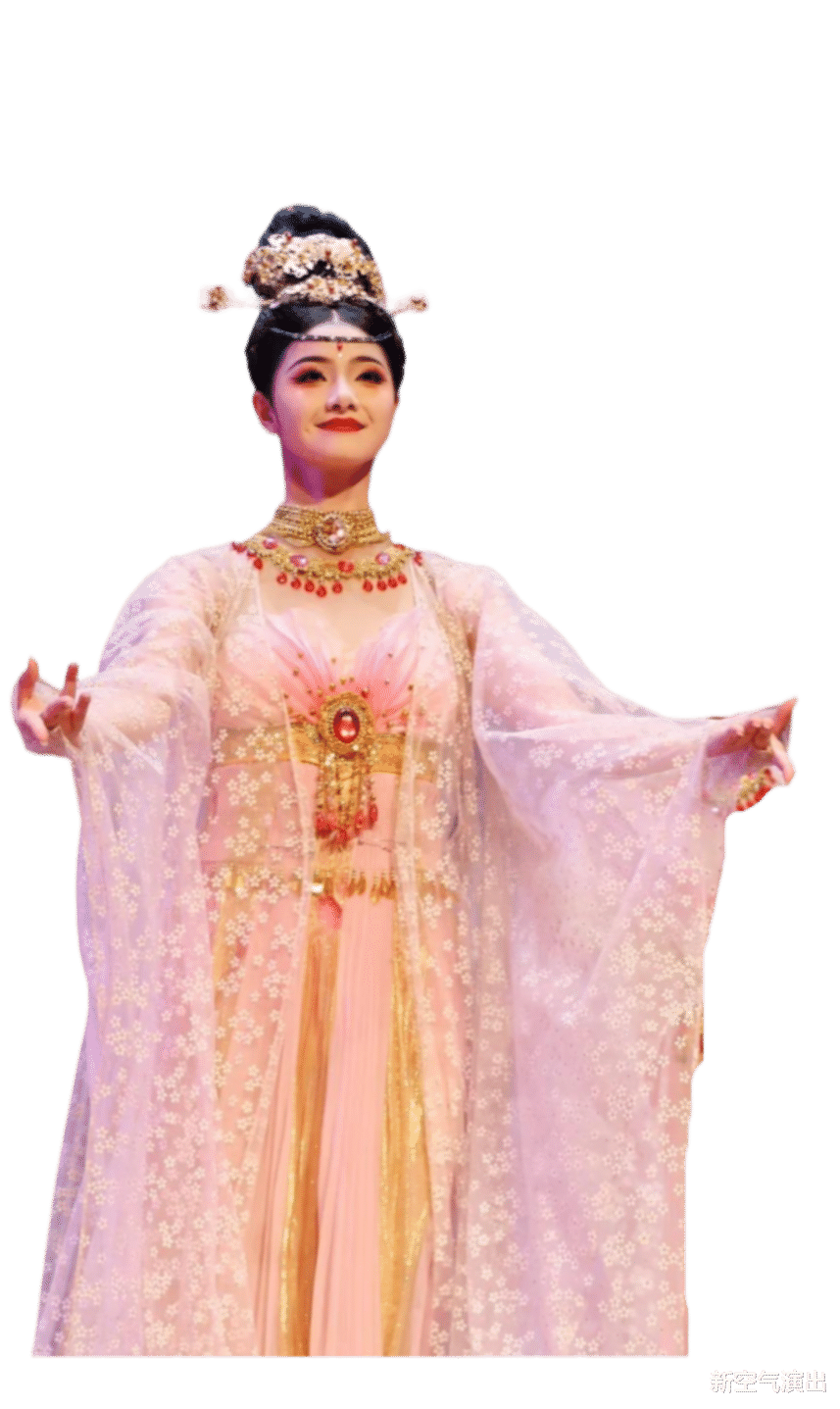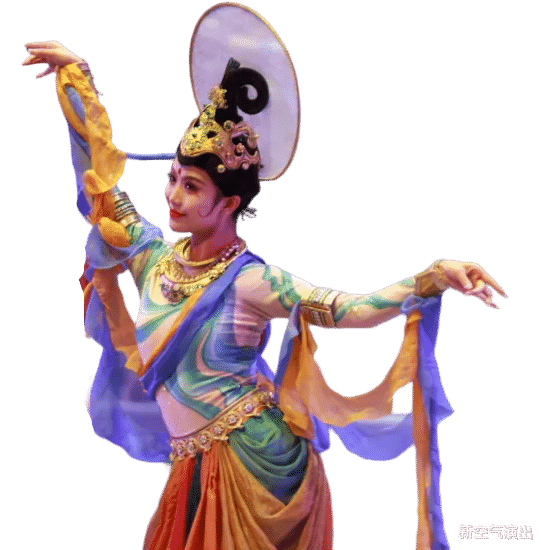 伎乐天服饰是《丝路花雨》激活敦煌美学的核心载体——它既严谨复刻了唐代丝路乐舞的形制精髓(如高腰裙、帔帛、金饰),又以“天衣飞扬”的动态设计破解了壁画静态到舞台动态的转化难题。其飘带、琵琶等特色更赋予千年伎乐以当代生命力,成为中华乐舞复兴的全球化符号。