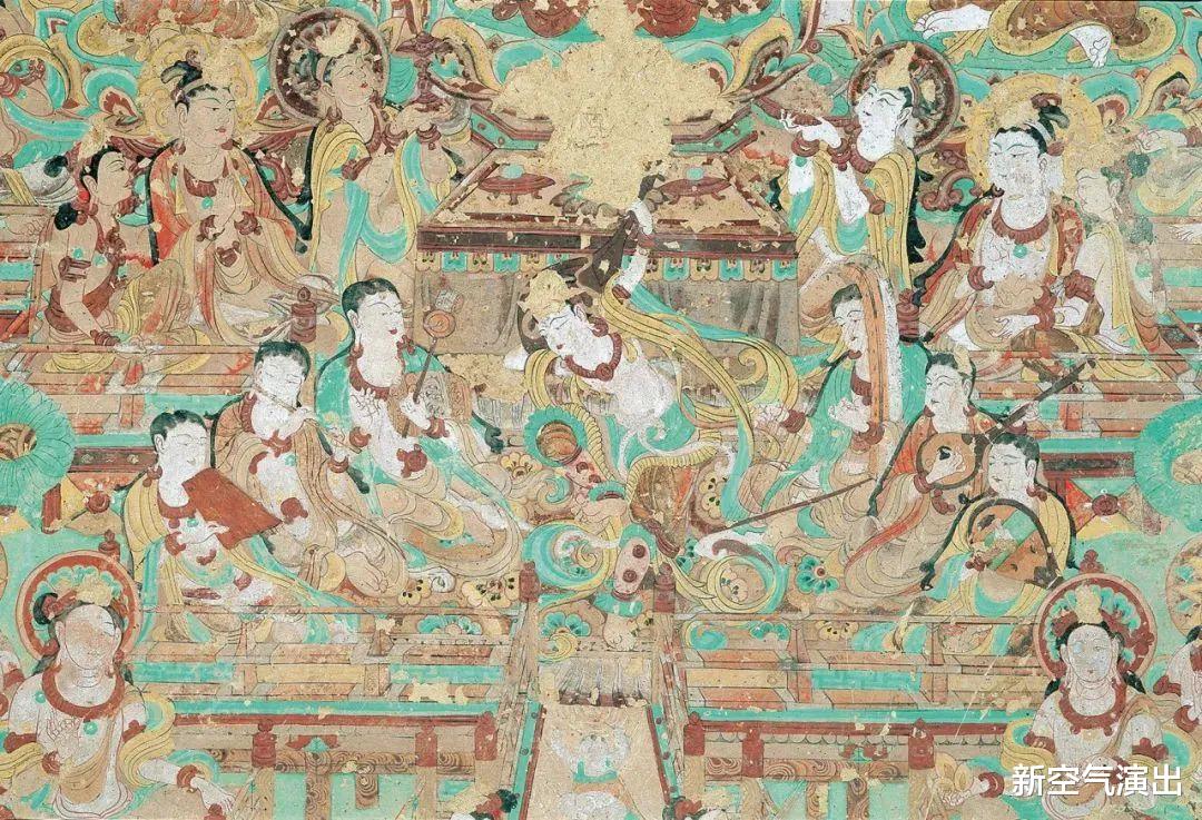 同时融合了唐代宫廷乐舞中的“菩萨装束”元素,如宝冠、金钏、披帛等,呼应敦煌壁画中唐代供养人服饰的华丽风格。