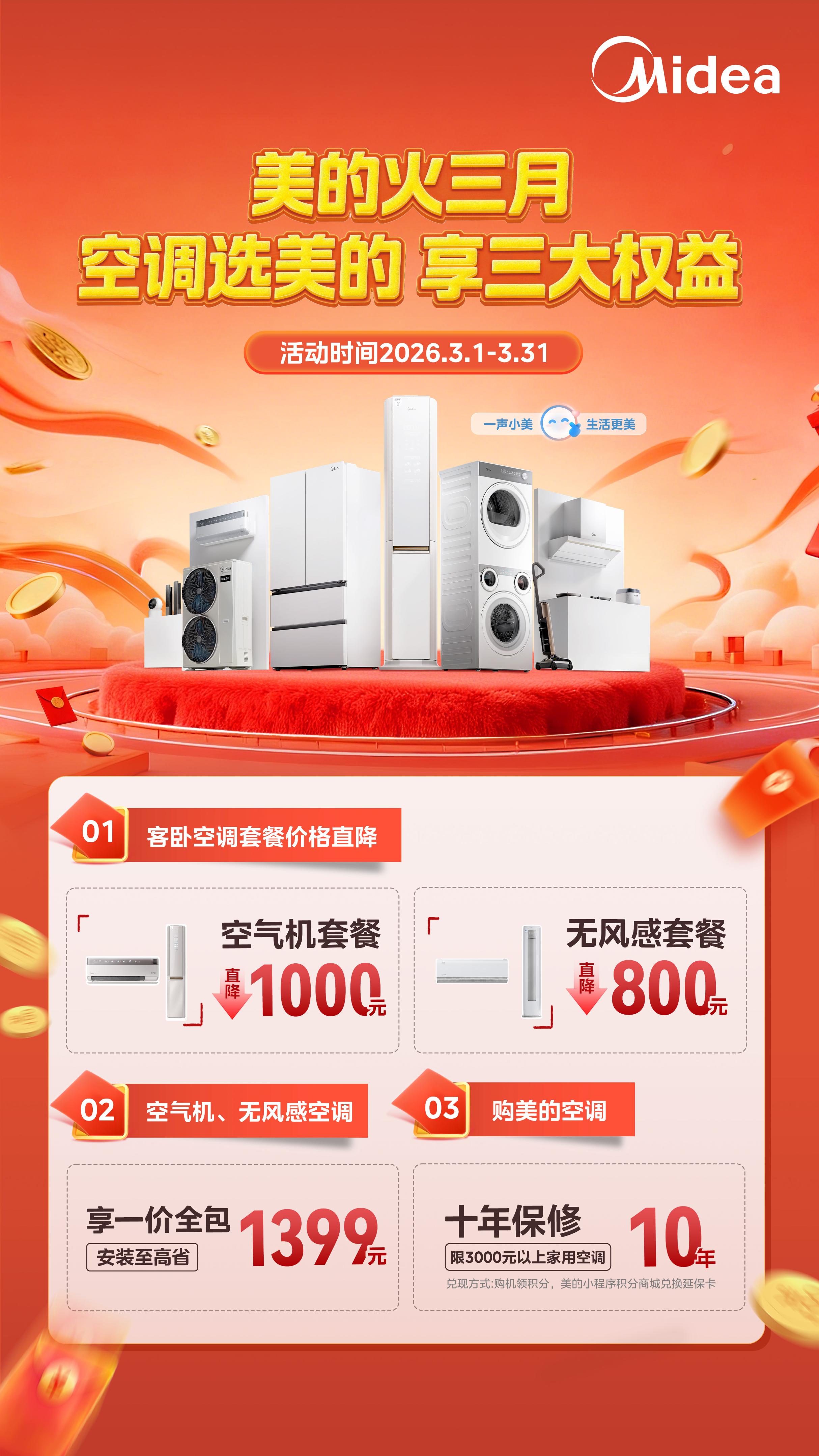 刚跟朋友推荐这款,他手机弹了个推送说3月1日到31日美的有火三月活动——客卧套餐直降,空气机和无风感一价全包,3000元以上机型还送10年保修呢。
