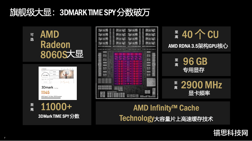 8060S显卡,拥有40组CU核心,3DMark TIME SPY分数超过11000;内存方面支持最高128GB四通道LPDDR5x-8000MT/s,依托统一内存架构技术,可将96GB内存划拨为专属显存,能够流畅运行GPT-OSS-120B、千问3.5-35B等超大模型,支持多智能体并行工作,满足高端AI推理、复杂内容创作、专业科研等高强度需求。