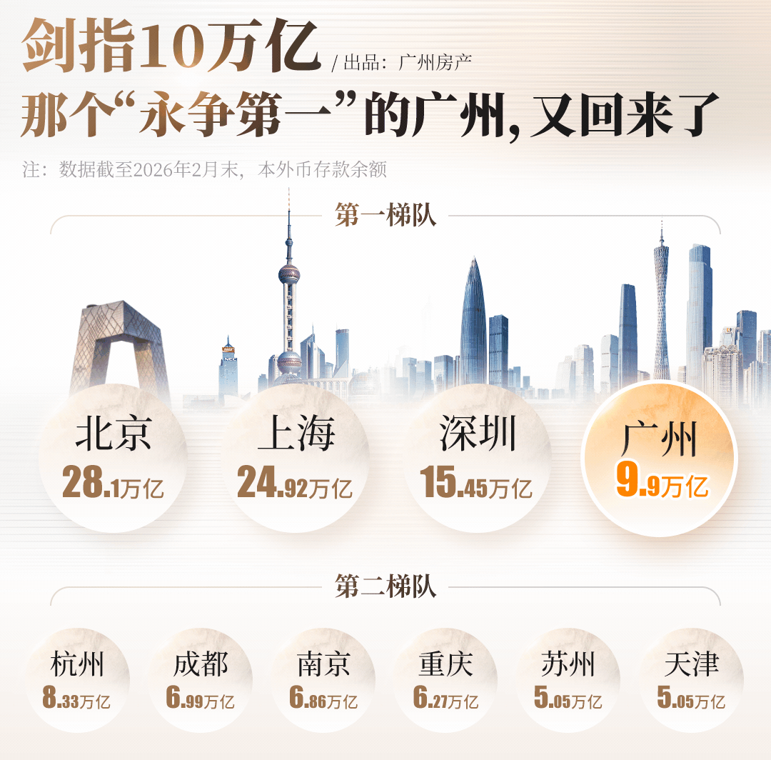 先说钱,一个比GDP更有含金量的指标——资金总量。广州已经达到9.9万亿,即将叩响全国第四个“10万亿之城”的大门,仅次北上深。