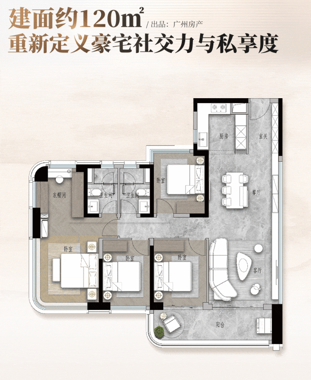 保利天曜把它带进了120㎡的户型里——这本身就是一种态度:任何户型,都值得最舒展的空间。
