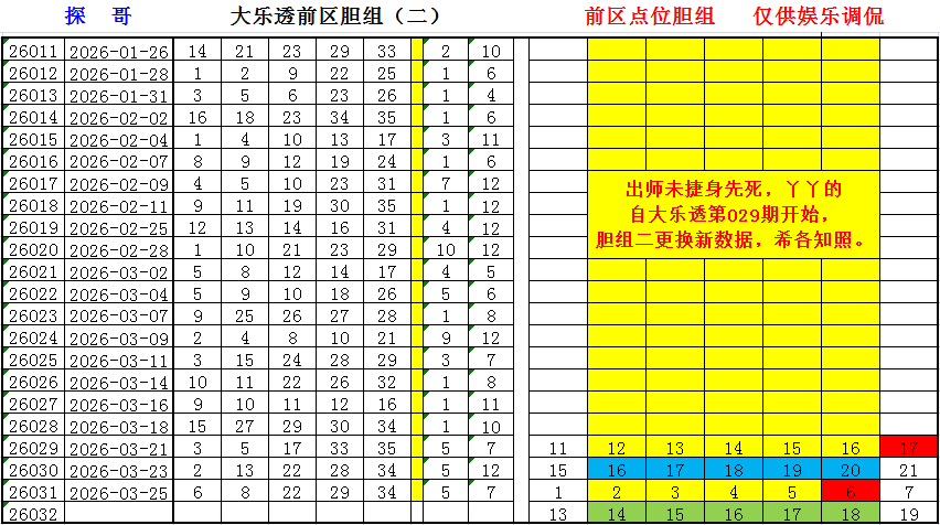 自大乐透第029期开始, 胆组一、胆组二更换新数据,希各知照。