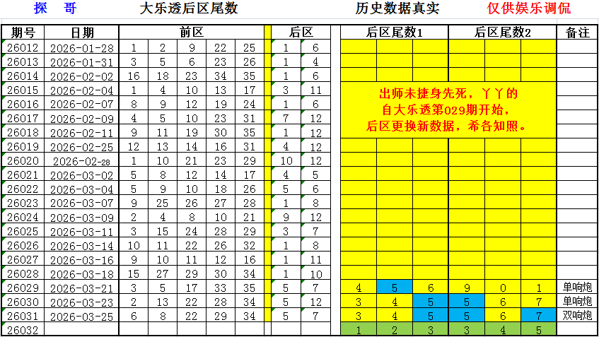 自大乐透第029期开始, 后区尾数更换新数据,希各知照。