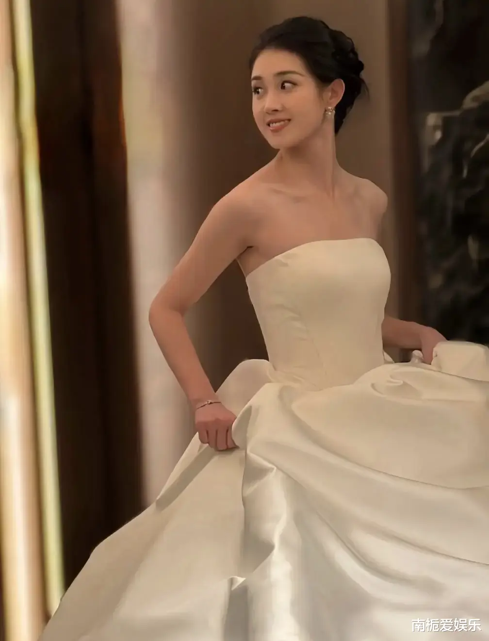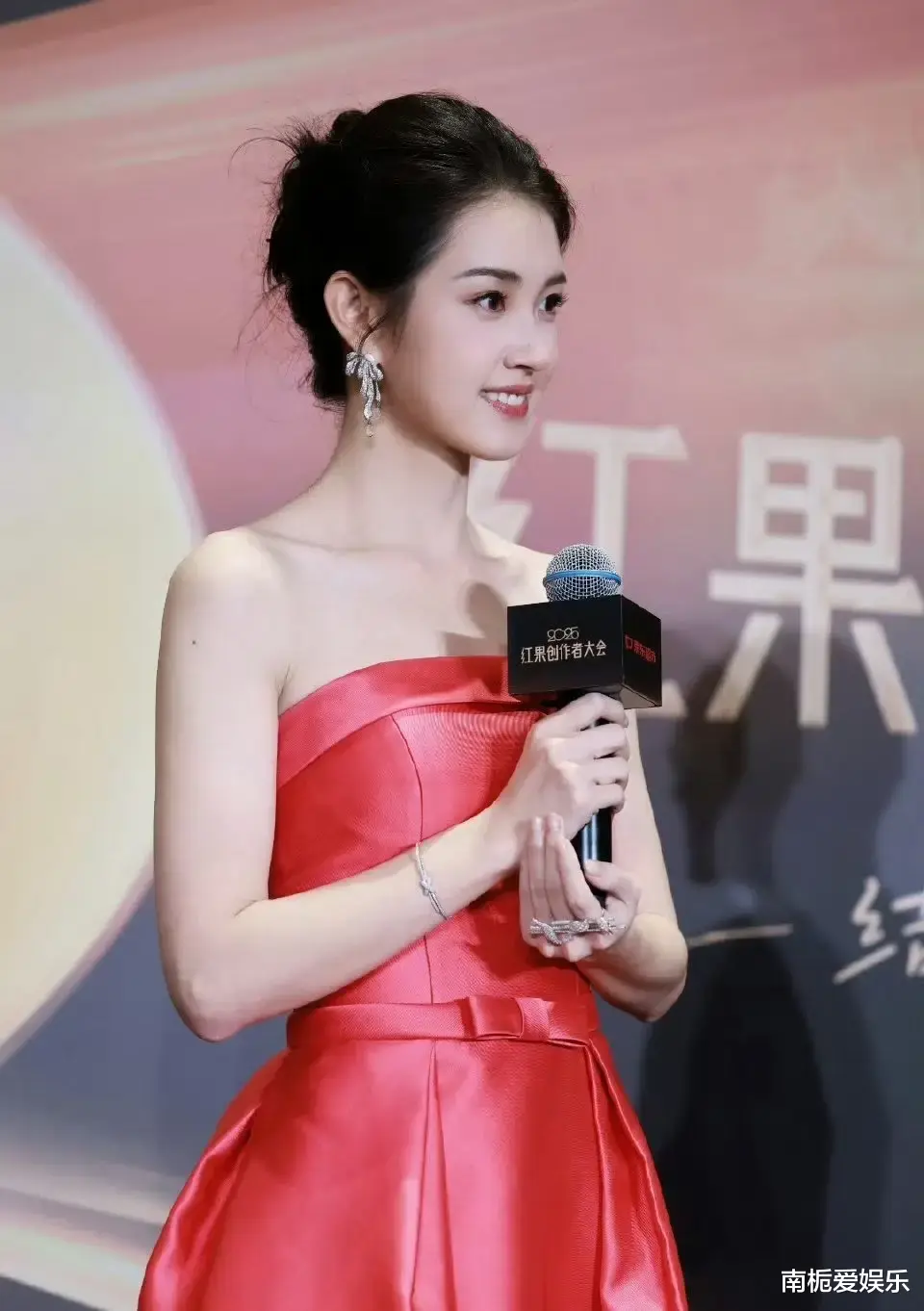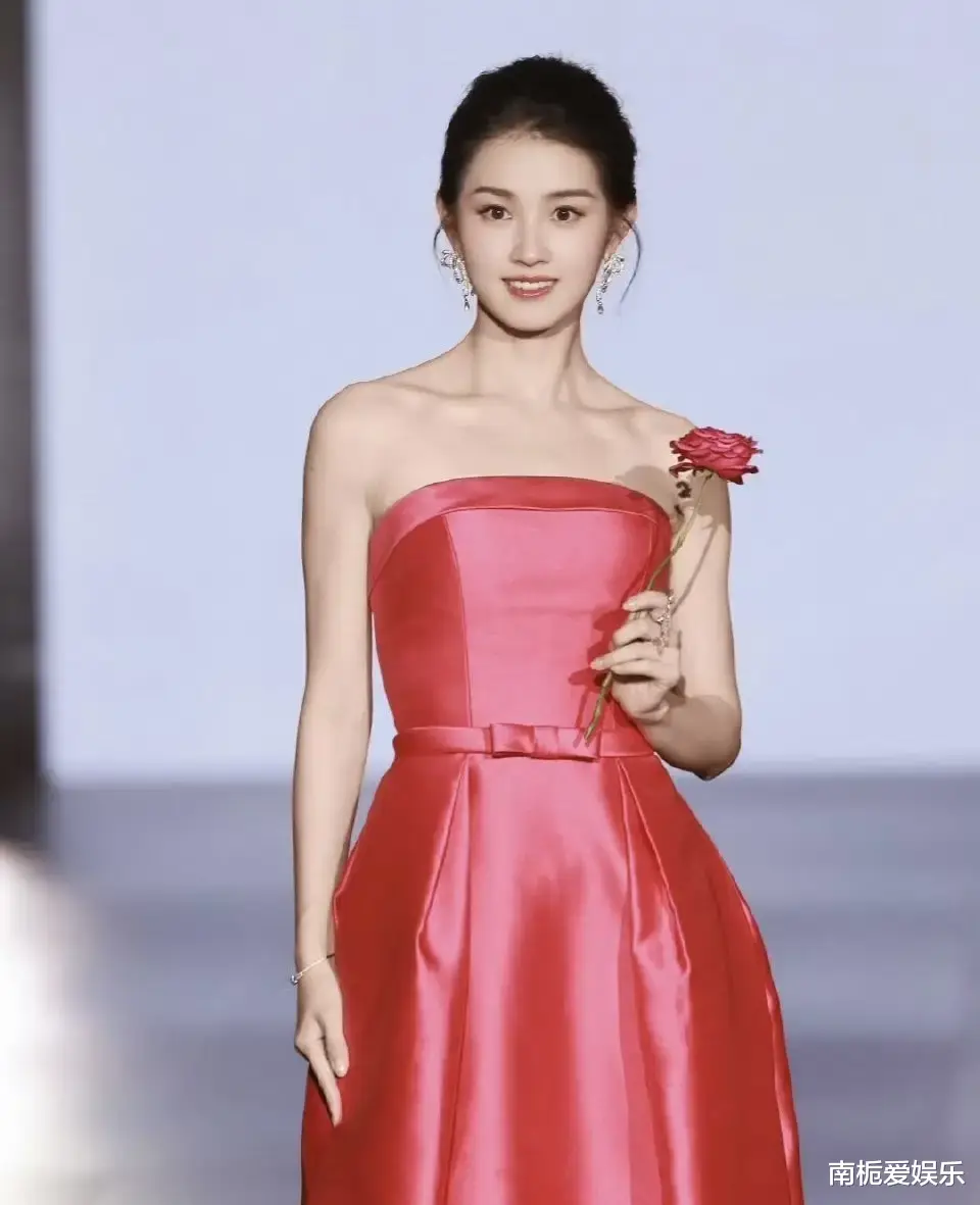 当郭宇欣换上那袭桃红色缎面抹胸长裙再度现身时,全场目光瞬间聚焦。不同于常见的正红,这抹偏粉的桃红色在灯光下泛着柔光,衬得她肌肤胜雪,气色极佳。抹胸设计完美展现她优越的肩颈线条,复古波浪长发更添几分妩媚风情。她手捧一束粉色玫瑰,笑容明媚,步履自信,仿佛将剧中的“粉德拉”角色带到了现实。“粉德拉”正是她主演爆款短剧《盛夏芬德拉》的粉丝爱称,播放量高达30亿,是当之无愧的“短剧女王”。