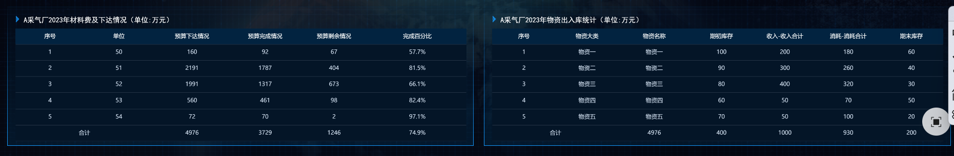 在物资采办管理驾驶舱中涵盖了各单位年材料费下达完成对比、预算完成百分比、A采气厂材料费及物资出入库等物资采办数据。