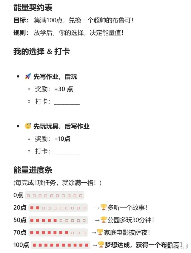娃不是老唠叨着要买他最爱的布鲁可吗,那我就跟他说:“如果你选择先写作业,完成后就能获得30点能量值。要是直接先玩,那就奖励10点能量值。攒够100点后,就能兑换一个布鲁可。”