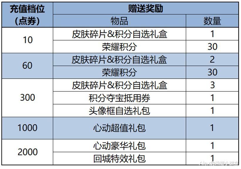 活动时间7月3日-7月6日,每日充值到对应档位,可领取皮肤碎片、荣耀积分和回城特效礼包等奖励。
