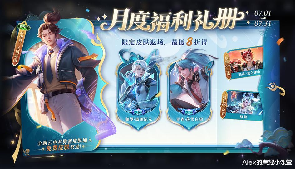 活动时间7月1日-7月31日,亚连-落雪白狼、伽罗-琥珀纪元加入惊喜折扣奖池,最低可刷新到8折。