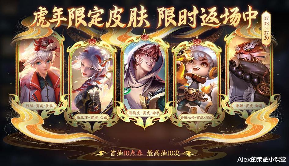 活动时间7月3日-7月20日,裴擒虎、鲁班七号、杨玉环、廉颇和孙膑虎年限定皮肤,通过祈愿抽奖活动获取。