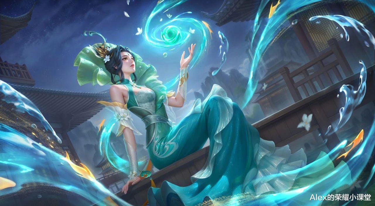 甄姬-逆浪荇歌品质勇者限定,通过S40赛季之旅任务获取,技能特效以青绿色为主,融入了白玉荇菜、水流涟漪等元素。