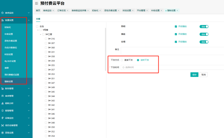 4、定时控制:支持设置宿舍某个用电回路每天的定时分闸合闸,例如可以设定早上6点开灯、晚上10点关灯。还支持对工作日和双休日进行区分设置,根据不同的日期类型灵活调整作息时间,最大支持一天八个时间段的设置。