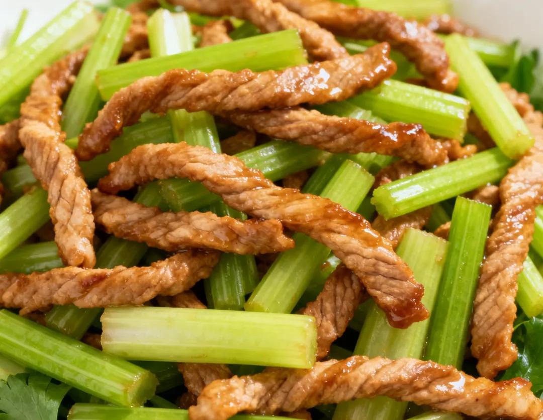 再倒入肉丝。大火翻炒均匀,淋少许水淀粉勾芡即可。芹菜脆嫩、肉丝鲜香,清热润燥,还能促进肠道蠕动。
