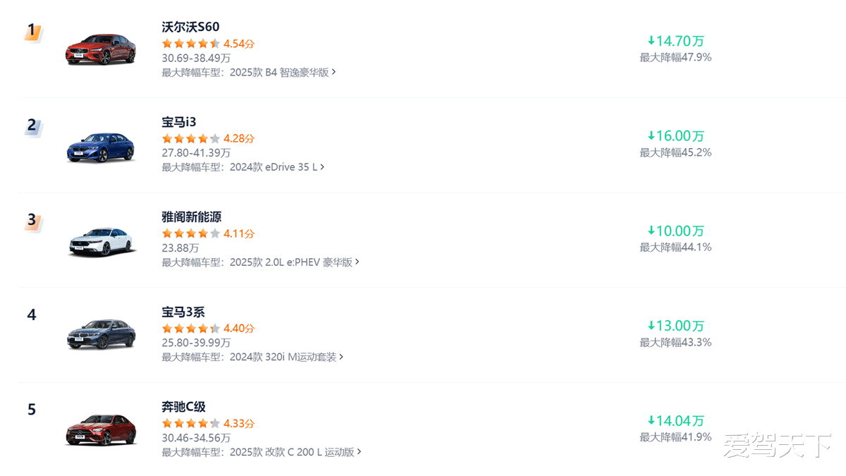 而且现在的价格真的太香了,当年落地要20多万的雅阁、凯美瑞,现在终端优惠普遍在4到6万,裸车价直接跌到12到13万区间,落地也就14万左右,比当年的A级车还便宜。就连宝马、奥迪这样的豪华B级车,优惠后20多万就能拿下,降幅最高的沃尔沃,甚至达到了47.9%。