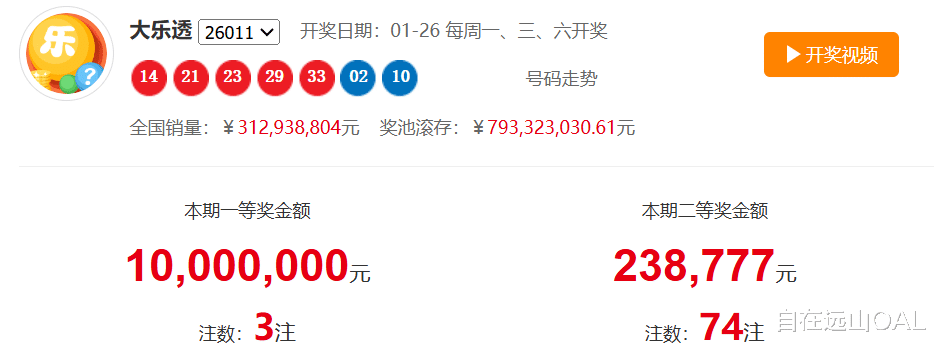 本期开奖号码:前区:14、21、23、29、33;后区:02、10。