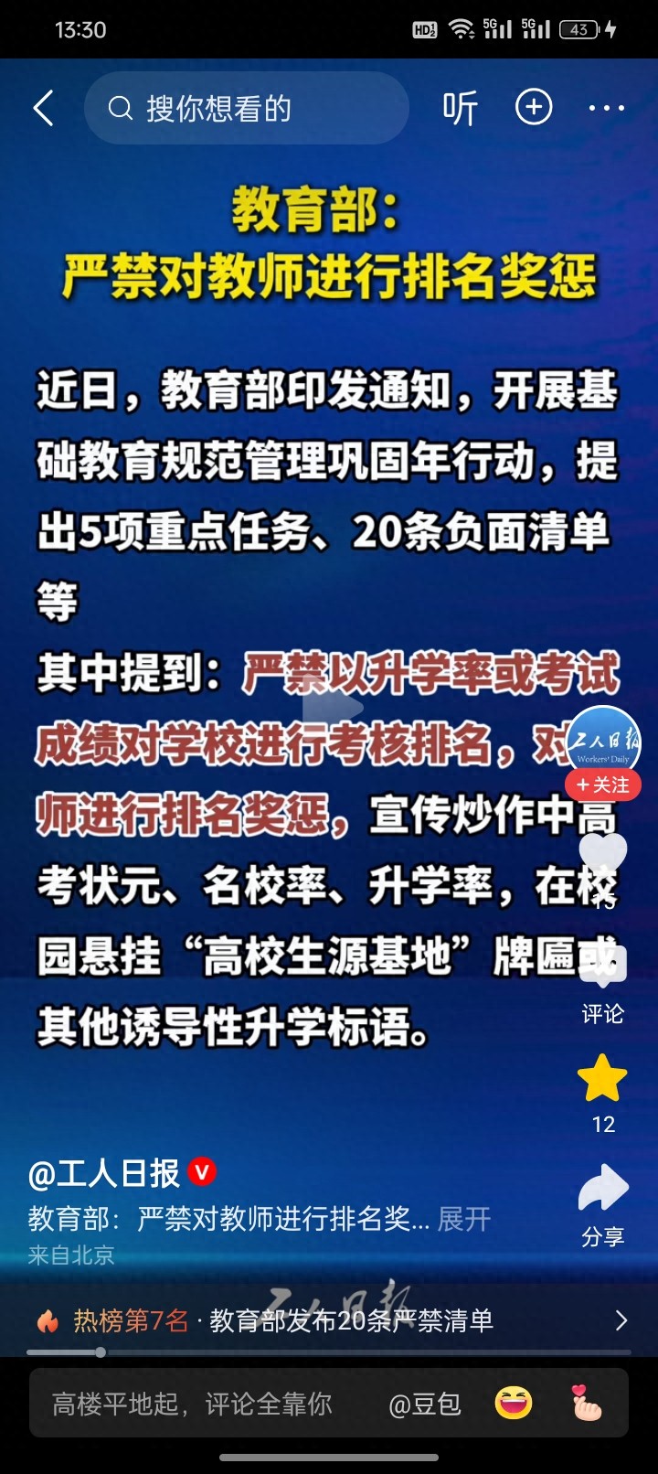 短短一句话,让无数老师和家长瞬间破防,分量格外重:严禁以升学率或者考试成绩进行考核排名,不得对教师进行排名奖惩。