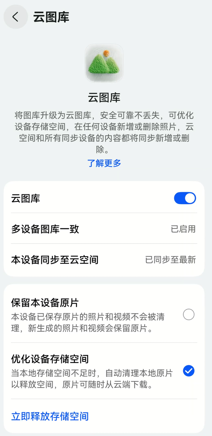 因为我提前打开了华为云空间-云图库功能,它就像一个极其聪明的管家,自动把你拍下的高清原图,第一时间同步到云端珍藏起来;我还开了【优化设备存储空间】,不常用的照片视频,本地只保留预览图,不占空间,需要用原图的时候可以随时到云端去下载,超省心~