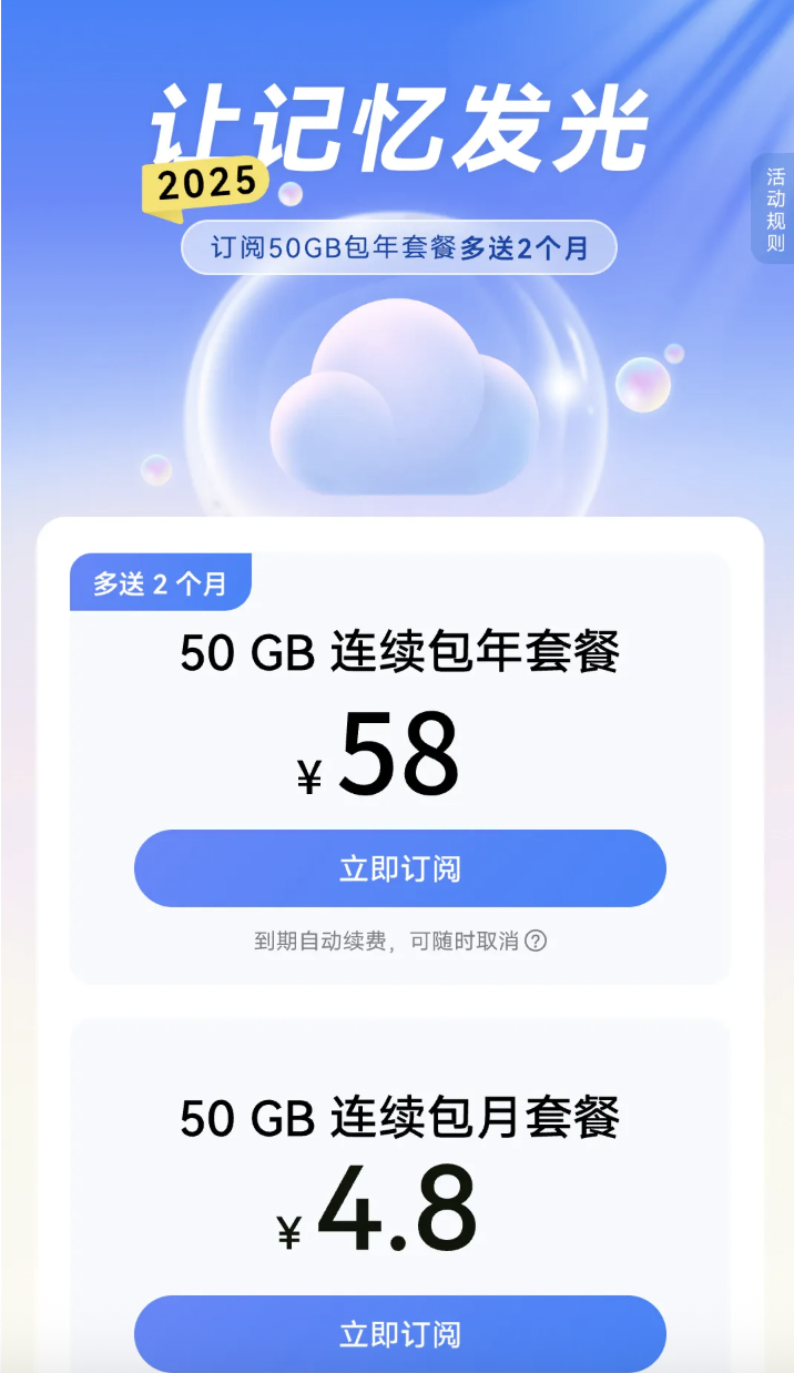 在这个辞旧迎新的节点,必须给大家安利一波华为云空间的年末福利——【2025 让记忆发光】活动!到12月31日,订阅华为云空间50GB连续包年套餐,只要58元/年,而且限时多送2个月!算下来,也就是几杯奶茶的钱,就能让自己的生活、工作更从容。2026,让我们继续轻装上阵,去创造更多值得被云空间珍藏的高光时刻吧!