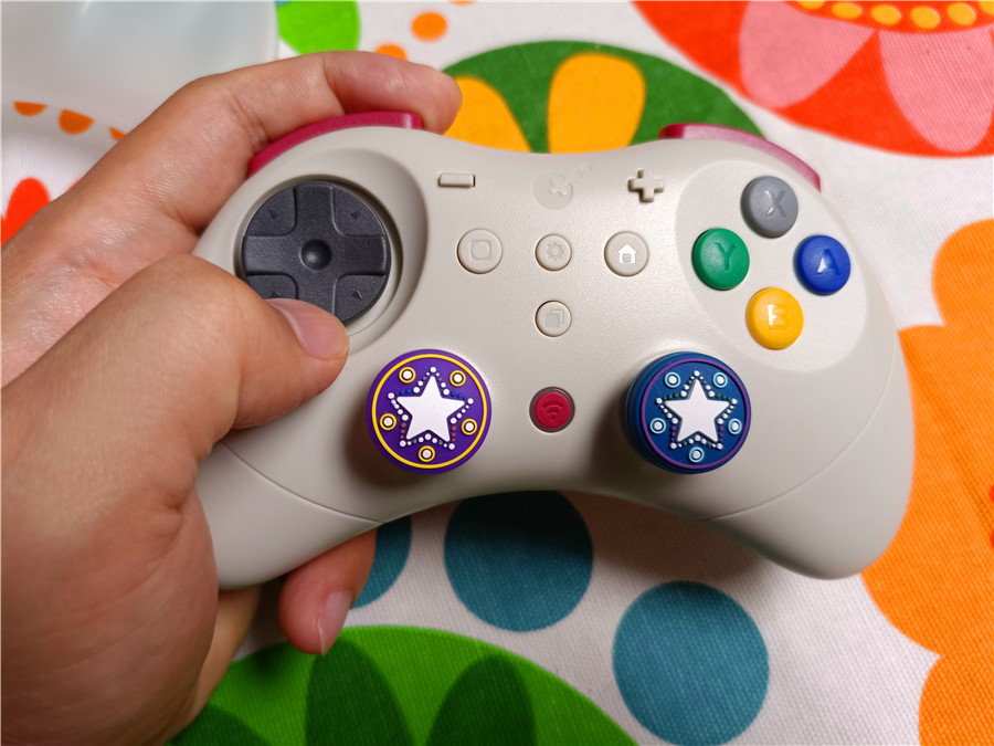 打开包装,能够看到这款手柄包括手柄本体(带收纳盒)、Type-C充电线、谷粒的Logo贴纸、说明书。官方标配塑料收纳盒,平时放手柄防尘特别方便,最贴心的是还送了一对星愿摇杆帽,装上之后手柄颜值立马提升,摇杆手感也更好了,套上摇杆帽后可能无法完全放入收纳盒,建议官方调整收纳盒大小。