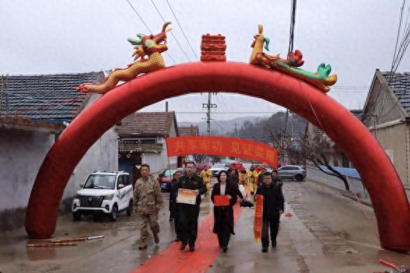 上午九时三十分,锣鼓喧天,横幅招展,喜雨绵绵,热闹非凡。县退役军人事务局联合县人武部、街头镇党委,组成“送喜报小分队”,高举鲜艳的横幅,手捧沉甸甸的立功喜报和奖励金,带着秧歌队、锣鼓队,专程来到现役军人张子良的家中。而今天,恰好也是张子良同志新婚大喜的日子。