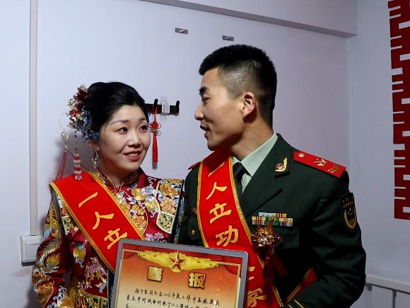 当立功喜报遇上火红“囍”字,家国情怀与儿女情长在此刻交织。张子良紧紧握着妻子的手,激动地说:“这份特殊的荣誉,是我送给妻子最好的新婚礼物,也是我继续精武强能的动力。感谢组织的培养,家乡党委、政府的鼓励和家人的支持,我会带着这份荣光,在强军路上继续奔跑,为祖国站好岗,守好大家,也护好小家。”