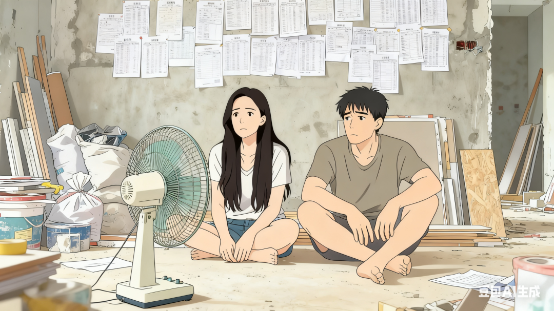 交房后没钱装修,只能先住毛坯房,夏天没空调,俩人就坐在地板上吹风扇。