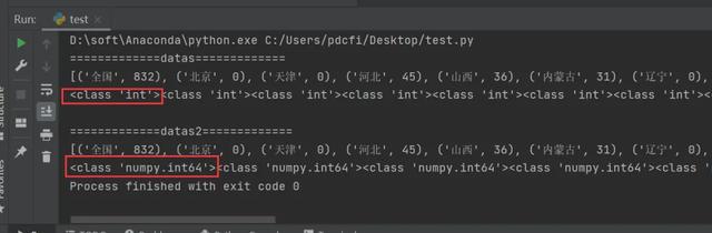 可以清晰的看到datas列表里边的数字的类型是int类型,而datas2列表里边的数字的类型是numpy.int64类型,而numpy.int64类型在html中是显示不出来的,因此问题就水落石出了。只需要在函数处理的时候将numpy.int64类型来个强转变为int类型,问题就迎刃而解了。只需要将func()函数中的代码替换成下面这个就可以了: