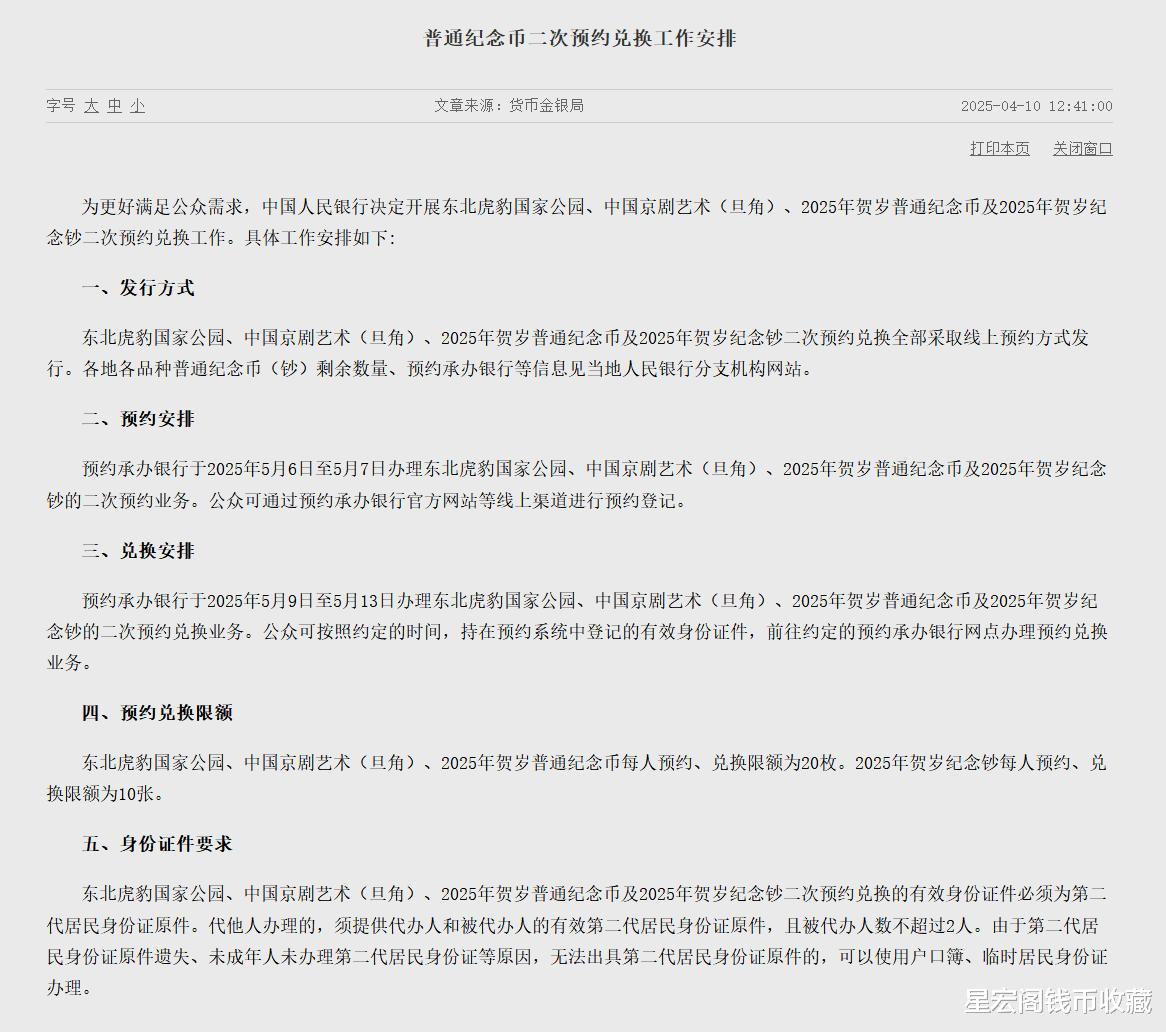 我也看了一下2024年普通纪念币和纪念钞发行情况以及二次预约的时间,2024年发行的普通纪念币和纪念钞,同样在整个一年当中都没有二次预约,到了2025年4月10日央妈公告进行二次预约,将于2025年5月6日至5月7日开启东北虎豹国家公园普通纪念币、中国京剧艺术(旦角)普通纪念币、2025年贺岁普通纪念币及2025年贺岁纪念钞二次预约兑换工作。