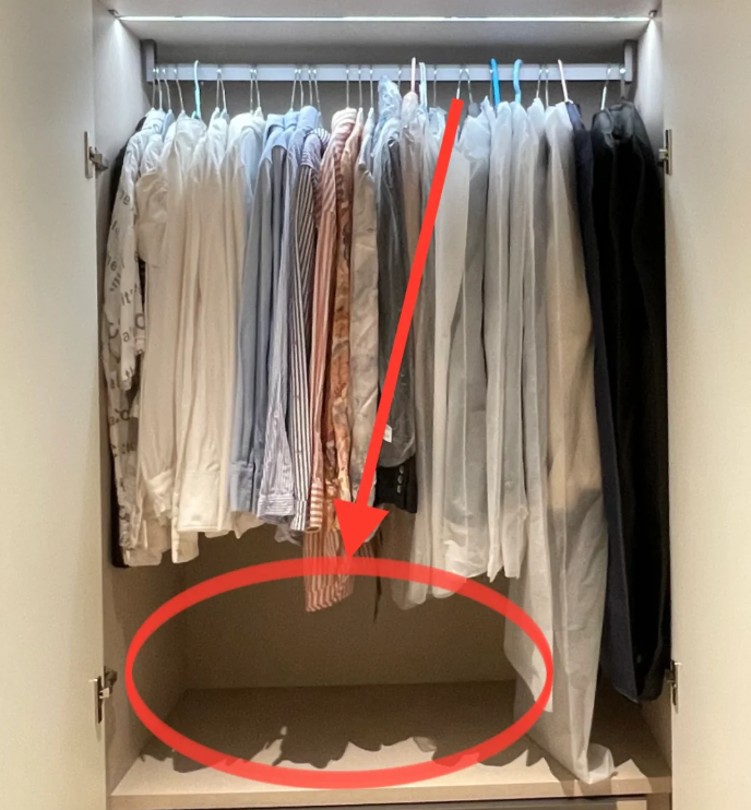 你家的衣柜是不是这样的?空间不能被合理的利用上。挂衣服区底部会有空间浪费,将衣服叠好之后放在这里,很快又会乱七八糟。其实我们可以使用衣服收纳筐来收纳这些叠好的衣服,