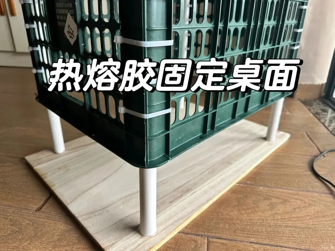 装修的时候剩下的一块废弃木板,或者是家里有不要的小桌子,也可以将板面拆下来,然后固定在pvc水管上面使用热熔胶固定,会更加牢固一些。